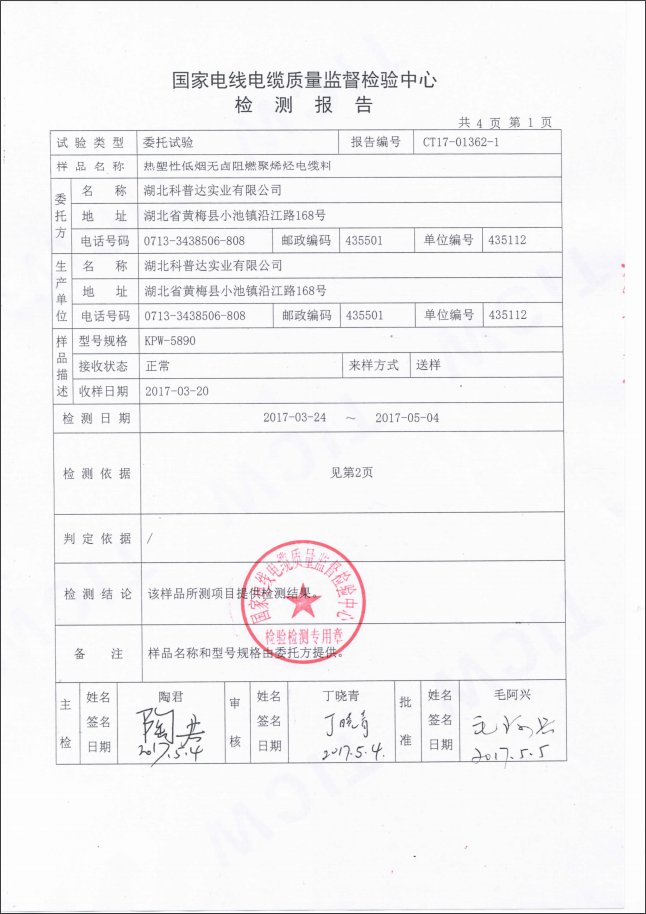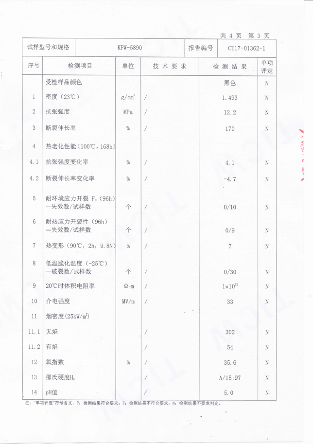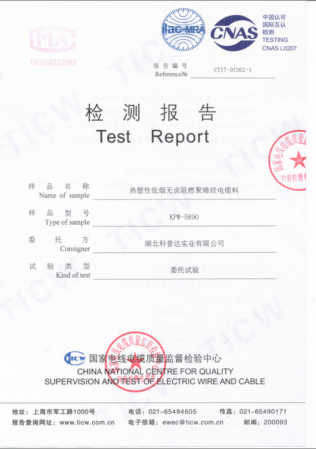 下一篇:KPW-5893抗開裂熱塑性低煙無鹵阻燃聚烯烴電纜料檢測報告